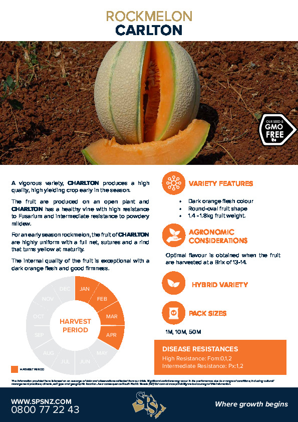 For an early season rockmelon, the fruit of CHARLTON are highly uniform with a full net, sutures and a rind that turns yellow at maturity.