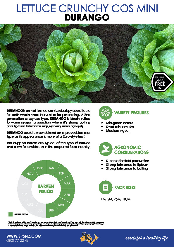 DURANGO is a small to medium-sized, crispy cos suitable for both whole head harvest or for processing. A 2nd generation crispy cos type, DURANGO is ideally suited to warm season production where it’s strong bolting and tipburn tolerance ensures very even harvests.