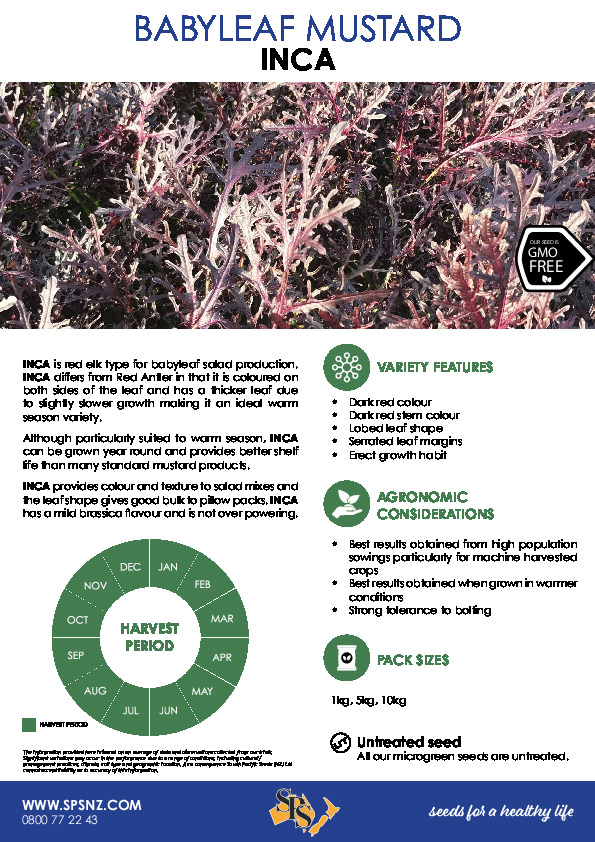 Although particularly suited to warm season, INCA can be grown year round and provides better shelf life than many standard mustard products. INCA provides colour and texture to salad mixes and the leaf shape gives good bulk to pillow packs. INCA has a mild brassica flavour and is not over powering.