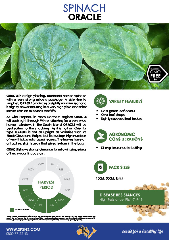 ORACLE is a high yielding, cool/cold season spinach with a very strong mildew package. A sister-line to Prophet, ORACLE produces a slightly rounder leaf and is slightly slower resulting in a very high yield and thick leaves with an excellent shelf life.