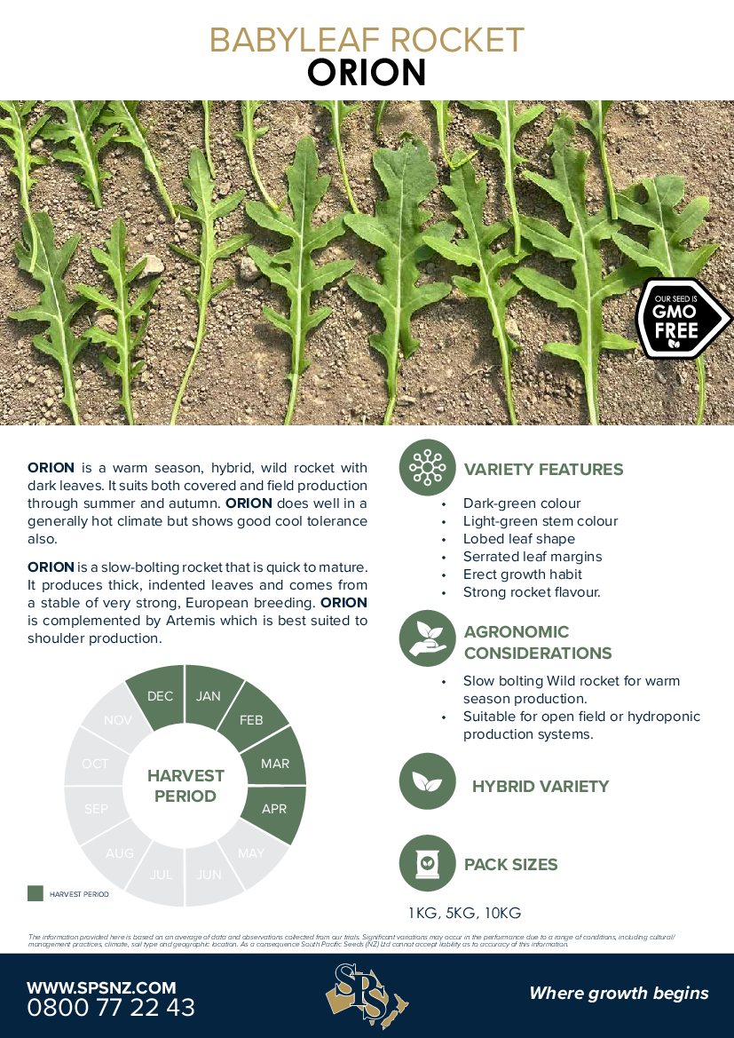 ORION is a slow-bolting rocket that is quick to mature. It produces thick, indented leaves and comes from a stable of very strong, European breeding.