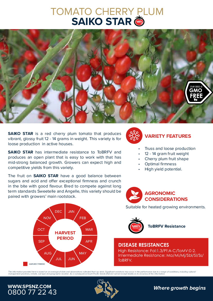 SAIKO STAR is a red cherry plum tomato that produces vibrant, glossy fruit 12 - 14 grams in weight. This variety is for loose production in active houses.