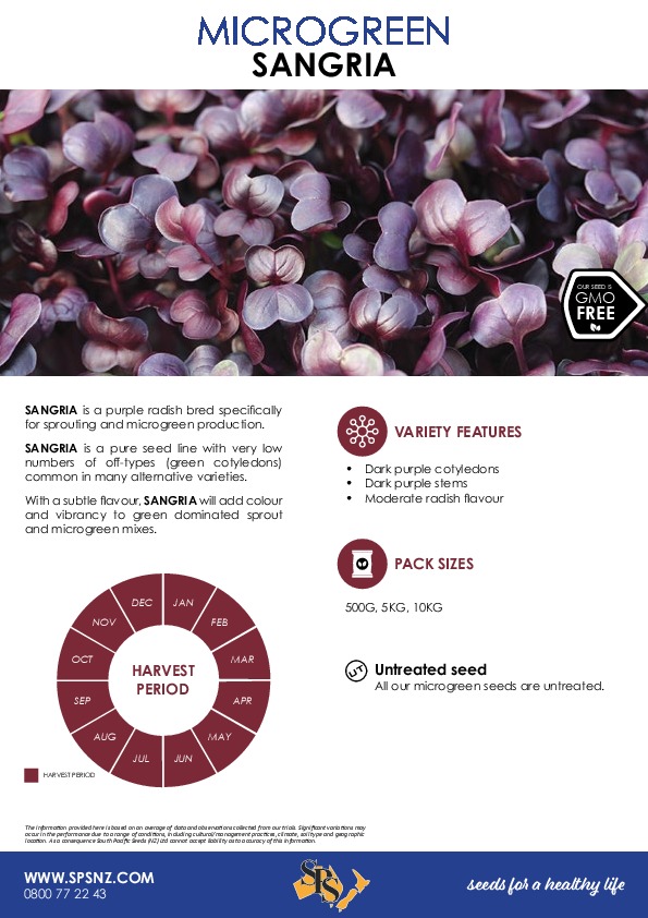 SANGRIA is a pure seed line with very low numbers of off-types (green cotyledons) common in many alternative varieties. With a subtle flavour, SANGRIA will add colour and vibrancy to green dominated sprout and microgreen mixes.