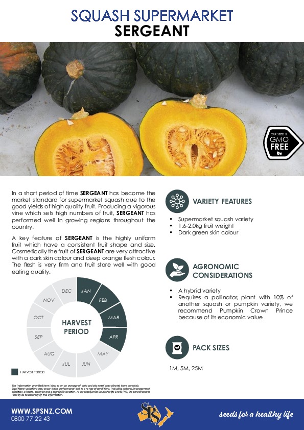 In a short period of time SERGEANT has become the market standard for supermarket squash due to the good yields of high quality fruit. Producing a vigorous vine which sets high numbers of fruit, SERGEANT has performed well In growing regions throughout the country.