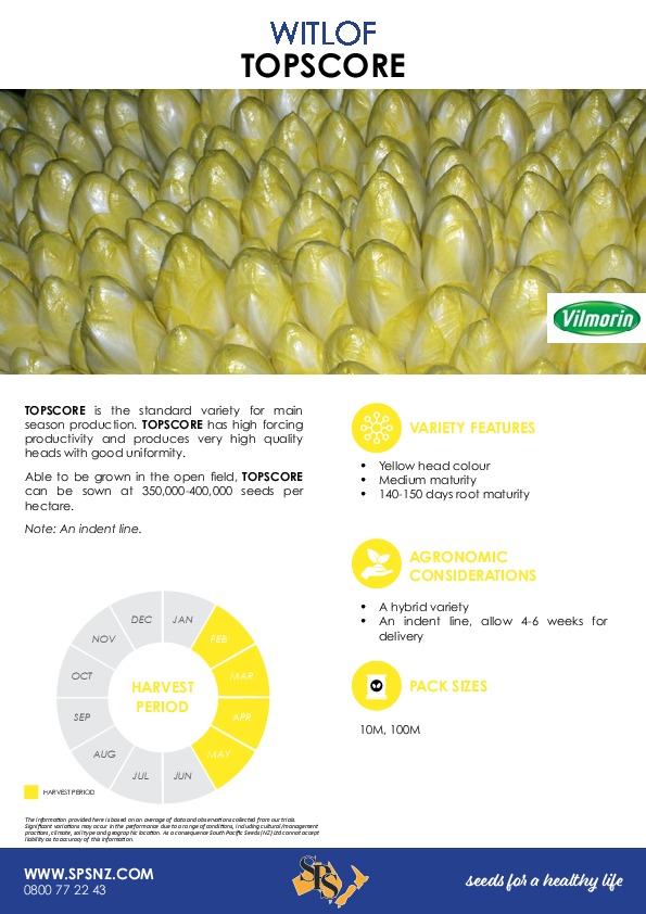 TOPSCORE is the standard variety for main season production. TOPSCORE has high forcing productivity and produces very high quality heads with good uniformity.
